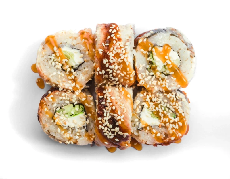 Состав: Угорь, сливочный сыр Креметте, салат айсберг, огурец, фирменный унаги соус, белый кунжут.