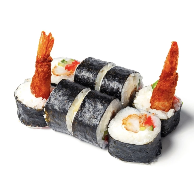 Тигровая креветка темпура, сыр Сливочный, огурец, имбирь маринованный.