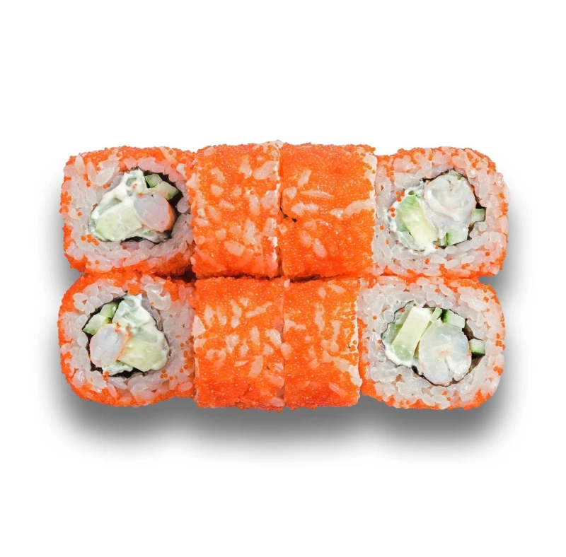 Состав: Тигровые креветки, икра красная тобико, огурец, майонез.