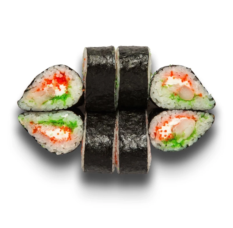 Состав: Креветка тигровая, сливочный сыр Креметте, икра красная тобико, икра зеленая тобико