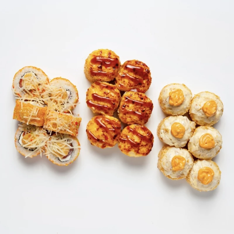 Эби пармезан - креветка тигровая, сыр сливочный и сыр пармезан, томат. Сансет- курица копченная, томаго,сыр сливочный, соус унаги Пряный кальмар- кальмар, сыр сливочный, огурец, соус спайс